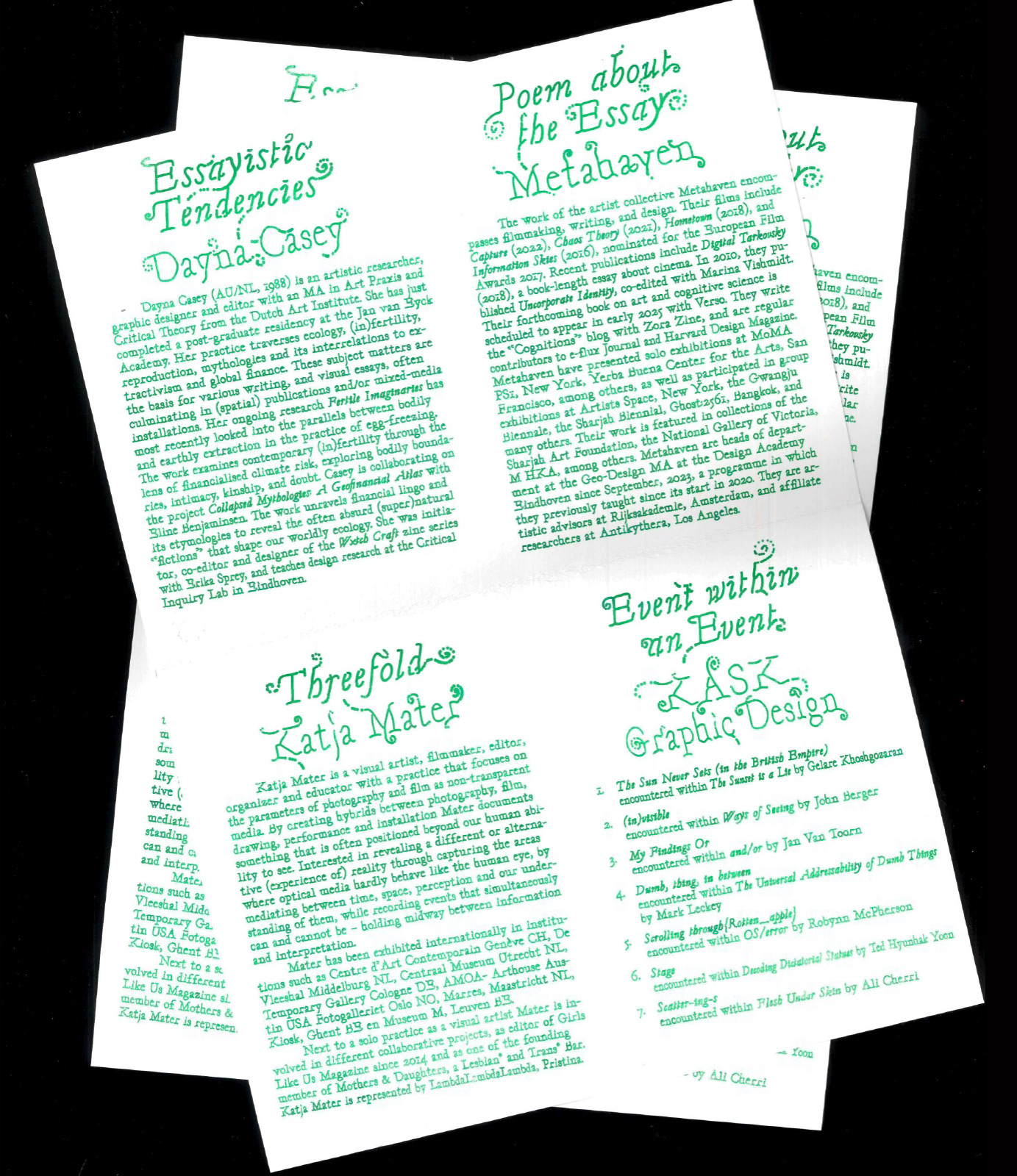 - Lecture, Essayistic Tendencies, with Metahaven and Katja Mater, at Meeting Grounds: Essay as Event. Invited by Paul Bailey, PhD KASK, Kunsthal Gent (BE), 2023